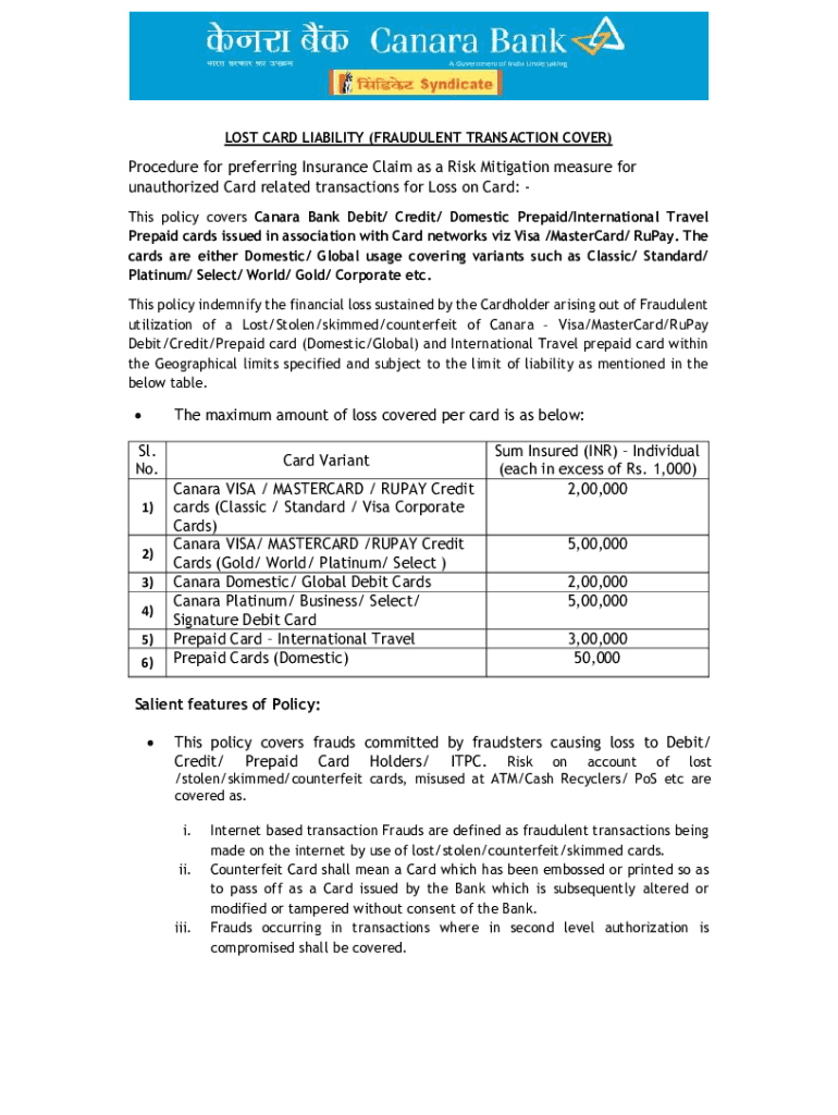 LOST CARD LIABILITY (FRAUDULENT TRANSACTION COVER)Procedure for preferring Insurance Claim as a Risk Mitigation measure for unauthorized Card related transactions for Loss on Card: This policy covers