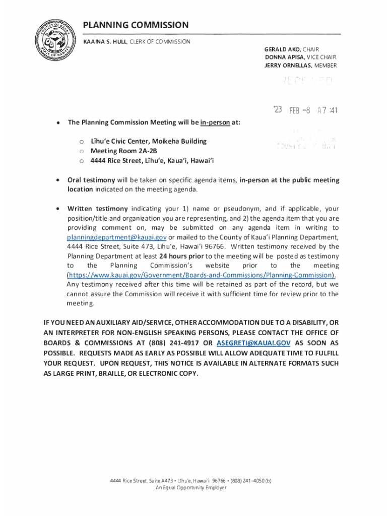 PLANNING COMMISSION KARINA S. HULL, CLERK OF COMMISSIONGERALD AKO, CHAIR DONNA PISA, VICE CHAIR JERRY PINELLAS, MEMBER23 FEB 8 A 7 :41 The Planning Commission Meeting will be unperson at: o Lieu\'e