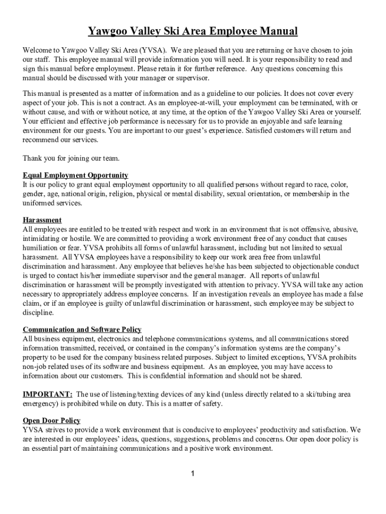 Yaw goo Valley Ski Area Employee Manual Welcome to Yaw goo Valley Ski Area (YES). We are pleased that you are returning or have chosen to join our staff. This employee manual will provide information