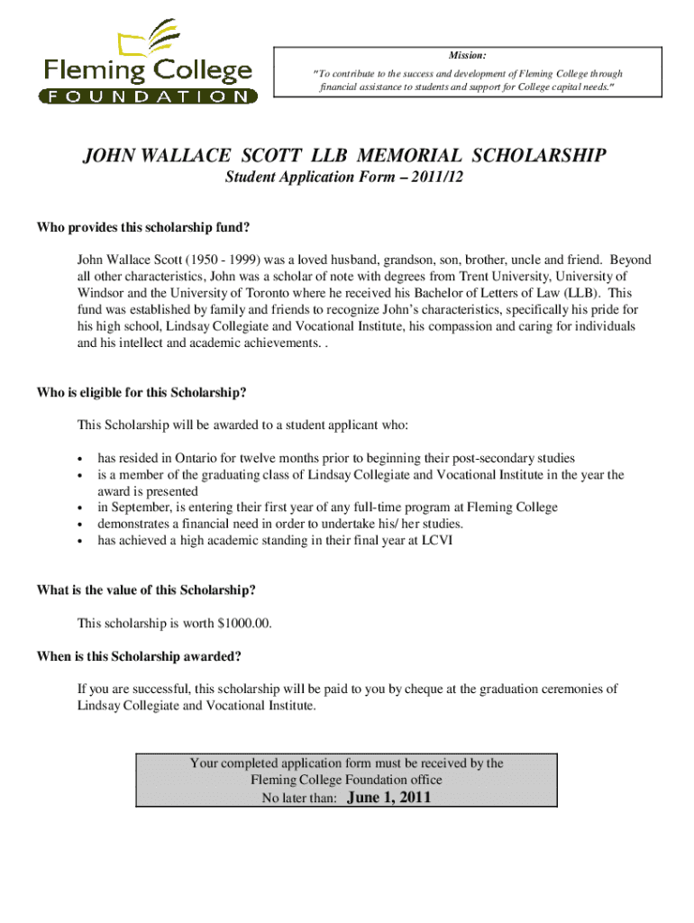 Mission: To contribute to the success and development of Fleming College through financial assistance to students and support for College capital needs. JOHN WALLACE SCOTT LLB MEMORIAL SCHOLARSHIP