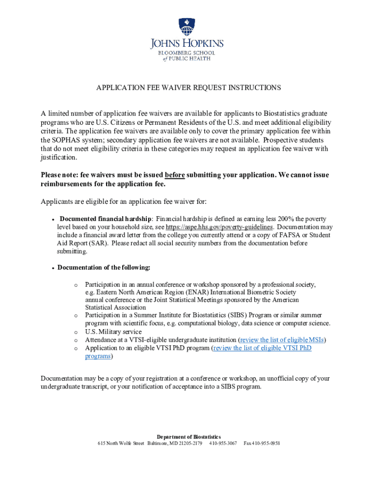APPLICATION FEE WAIVER REQUEST INSTRUCTIONS A limited number of application fee waivers are available for applicants to Biostatistics graduate programs who are U.S. Citizens or Permanent Residents