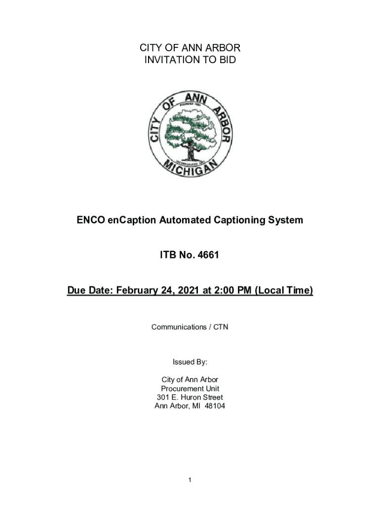 CITY OF ANN ARBOR INVITATION TO BIDE NCO exception Automated Captioning System ITB No. 4661 Due Date: February 24, 2021, at 2:00 PM (Local Time)Communications / Issued By: City of Ann Arbor Procurement