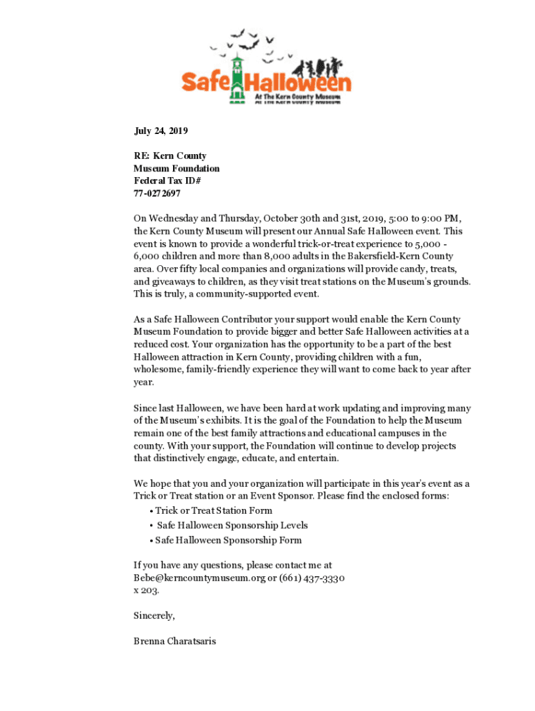 July 24, 2019, RE: Kern County Museum Foundation Federal Tax ID# 770272697 On Wednesday and Thursday, October 30th and 31st, 2019, 5:00 to 9:00 PM, the Kern County Museum will present our Annual Safe