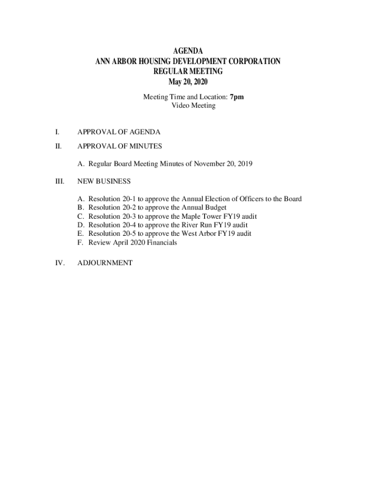 AGENDA ANN ARBOR HOUSING DEVELOPMENT CORPORATION REGULAR MEETING May 20, 2020, Meeting Time and Location: 7pm Video Meeting. APPROVAL OF AGENDA.APPROVAL OF MINUTES A. Regular Board Meeting Minutes