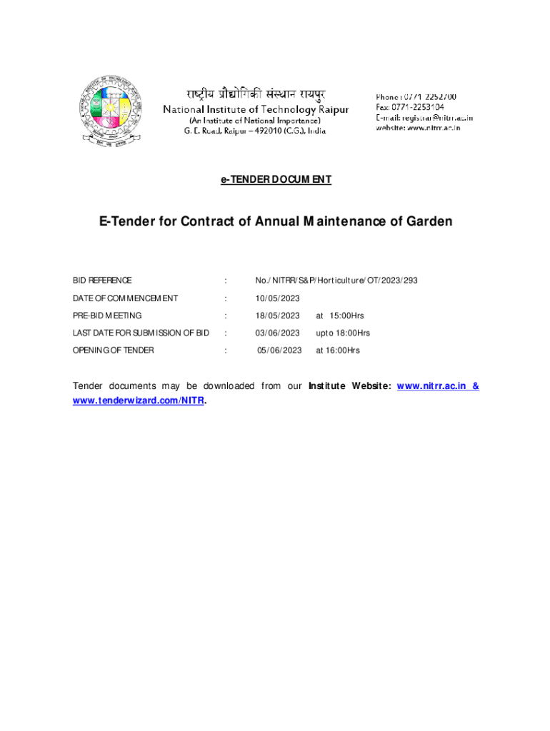 TENDER DOCUMENTETender for Contract of Annual Maintenance of Garden BID REFERENCE:No./NITRO/S&P/Horticulture/OT/2023/293DATE OF COMMENCEMENT:10/05/2023PREBID MEETING:18/05/2023at 15:00HrsLAST DATE