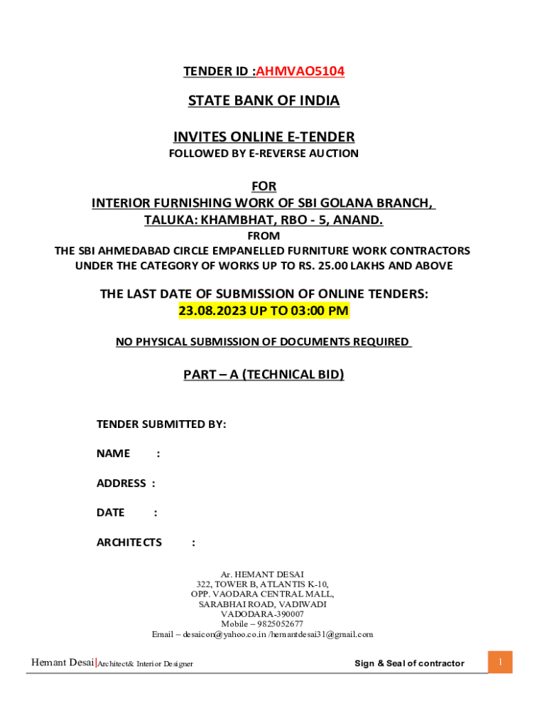 TENDER ID :AHMVAO5104STATE BANK OF INDIA INVITES ONLINE TENDER FOLLOWED BYE REVERSE AUCTIONEER INTERIOR FURNISHING WORK OF SBI GOLAN BRANCH, TALK: CHAMBRAY, HBO 5, ANAND. FROM THE SBI AHMEDABAD CIRCLE