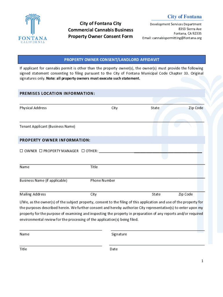 City of Fontana City of Fontana City Commercial Cannabis Business Property Owner Consent Redevelopment Services Department 8353 Sierra Ave Fontana, CA 92335 Email: cannabispermitting@fontana.orgPROPERTY