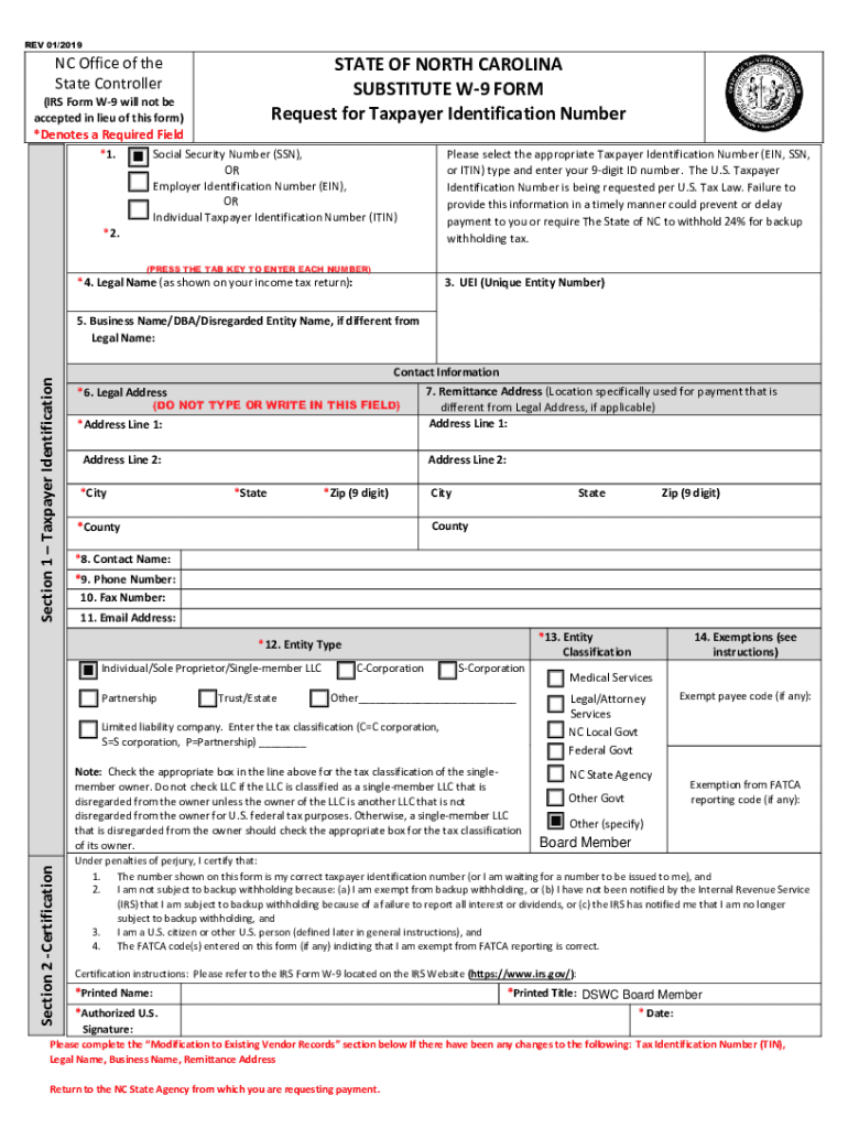 REV 01/2019STATE OF NORTH CAROLINA SUBSTITUTE W9 FORM Request for Taxpayer Identification Number NC Office of the State Controller(IRS Form W9 will not be accepted in lieu of this form)*Denotes a