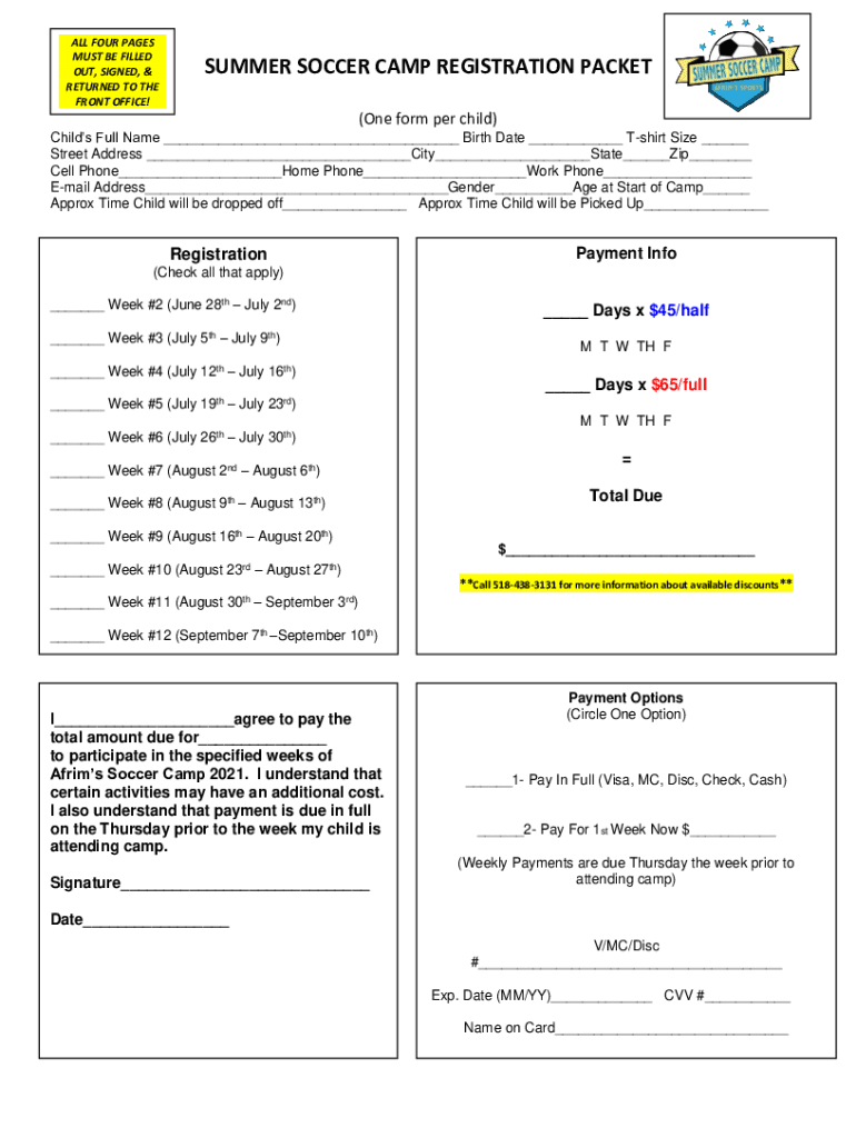 ALL FOUR PAGES MUST BE FILLED OUT, SIGNED, & RETURNED TO THE FRONT OFFICE!SUMMER SOCCER CAMP REGISTRATION PACKET (One form per child)Child's Full Name ___ Birth Date ___ Shirt Size ___ Street Address