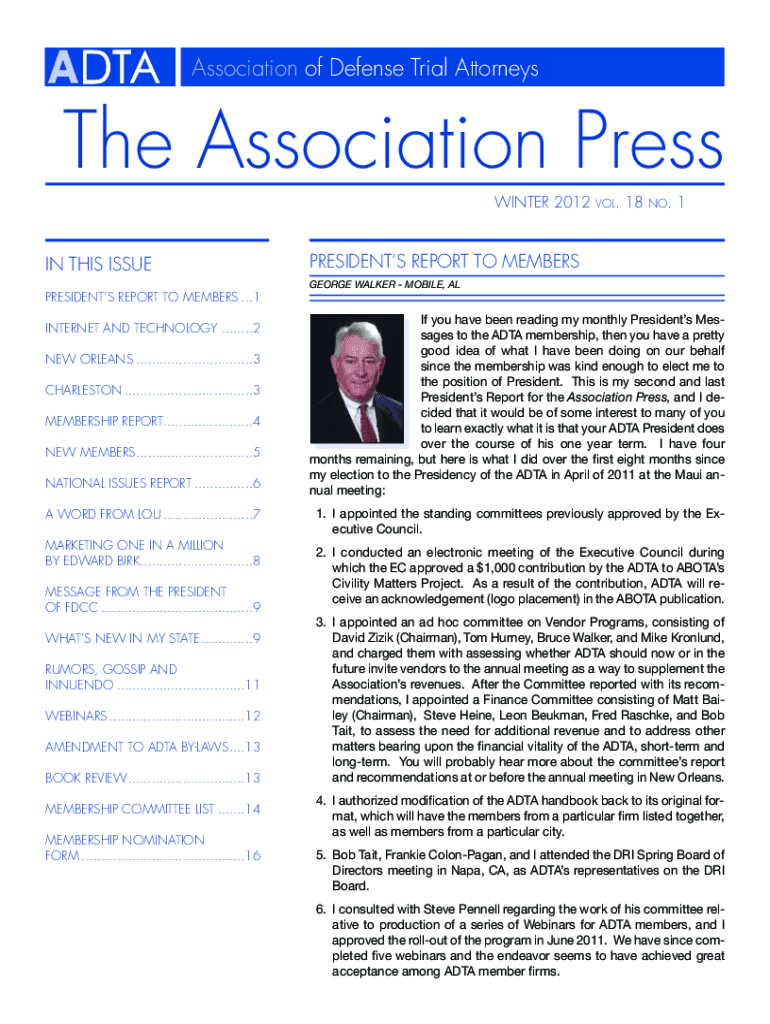 Association of Defense Trial Attorneys Association Press WINTER 2012IN THIS ISSUE.18NO.1PRESIDENTS REPORT TO MEMBERS GEORGE WALKER MOBILE, PRESIDENTS REPORT TO MEMBERS ...1 INTERNET AND TECHNOLOGY