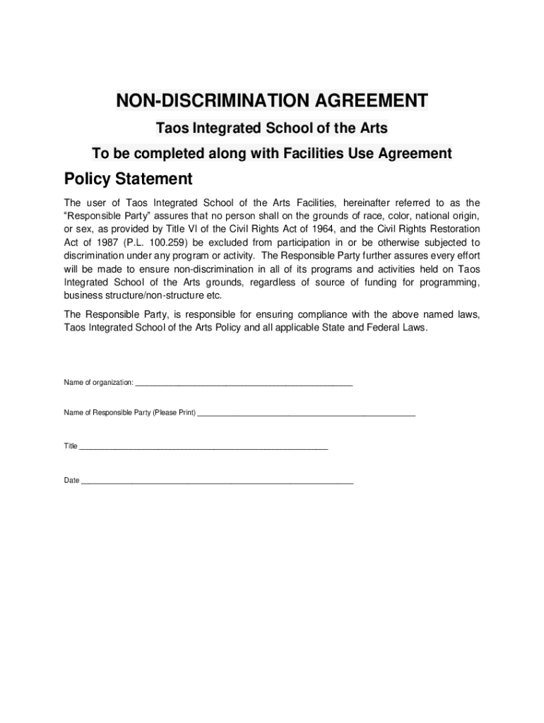 NONDISCRIMINATION AGREEMENT Tao's Integrated School of the Arts To be completed along with Facilities Use AgreementPolicy Statement The user of Tao's Integrated School of the Arts Facilities, hereinafter