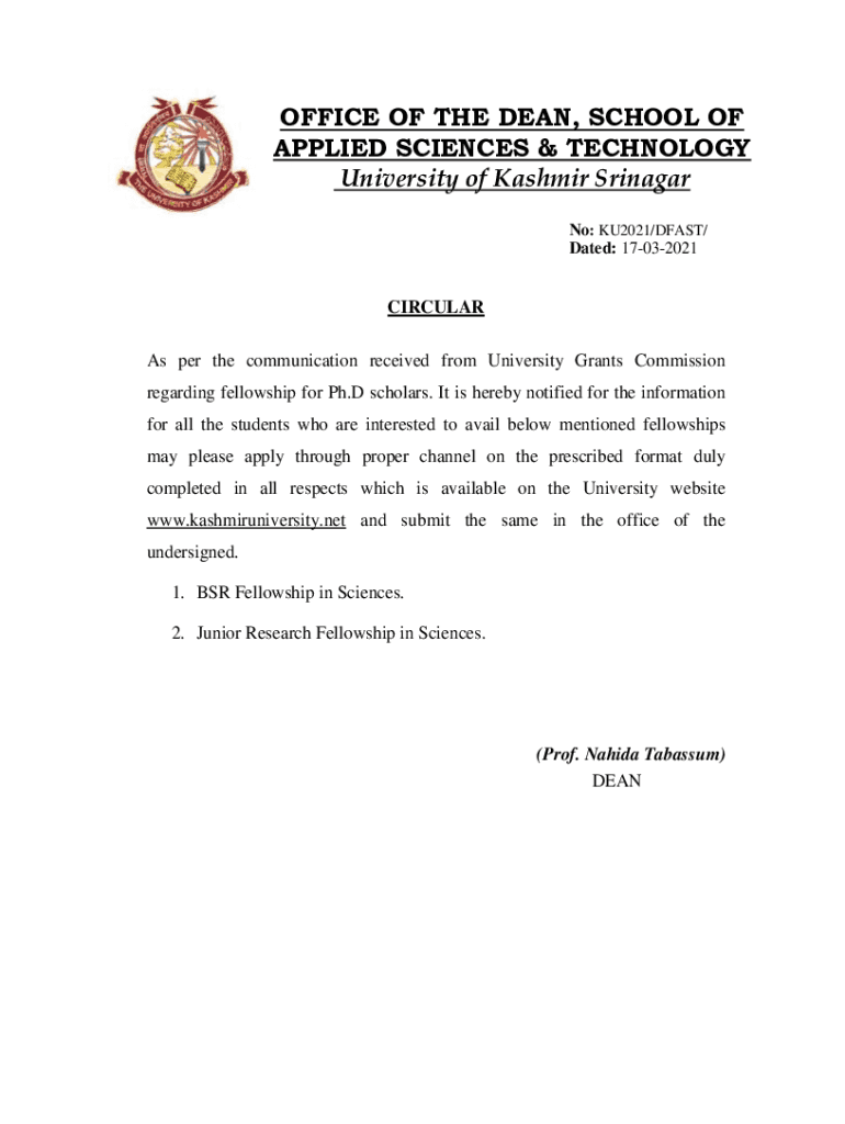 OFFICE OF THE DEAN, SCHOOL OF APPLIED SCIENCES & TECHNOLOGY University of Kashmir Srinagar No: KU2021/FAST/ Dated: 17032021CIRCULAR As per the communication received from University Grants Commission
