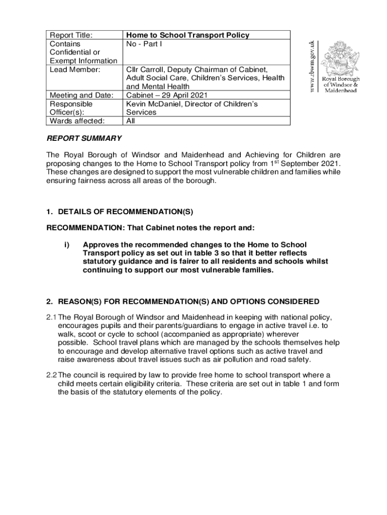 Report Title: Contains Confidential or Exempt Information Lead Member:Meeting and Date: Responsible Officer(s): Wards affected:Home to School Transport Policy No Part Ill Carroll, Deputy Chairman