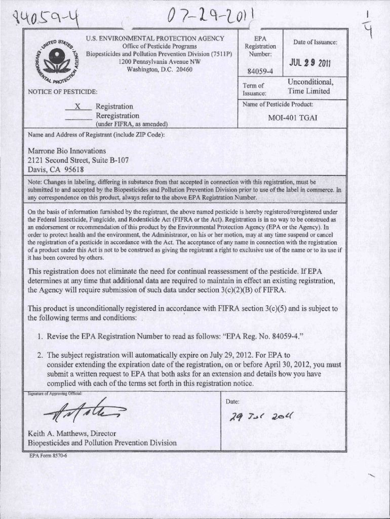 U.S. ENVIRONMENTAL PROTECTION AGENCY Office of Pesticide Programs Biopesticides and Pollution Prevention Division (751 IP) 1200 Pennsylvania Avenue NW Washington, D.C. 20460840594 Term of Issuance:NOTICE