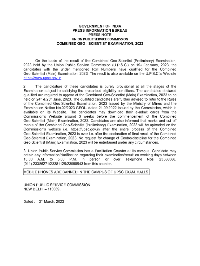 GOVERNMENT OF INDIA PRESS INFORMATION BUREAU PRESS NOTE UNION PUBLIC SERVICE COMMISSION COMBINED GEO SCIENTIST EXAMINATION, 2023On the basis of the result of the Combined GeoScientist (Preliminary)
