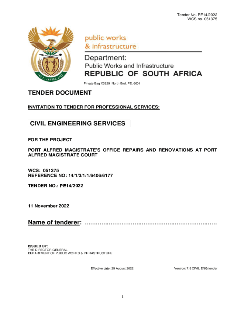 Tender No. PE14/2022 WCS no. 051375Private Bag X3929, North End, PE, 6001TENDER DOCUMENT INVITATION TO TENDER FOR PROFESSIONAL SERVICES:CIVIL ENGINEERING SERVICES FOR THE PROJECT PORT ALFRED MAGISTRATE\'S
