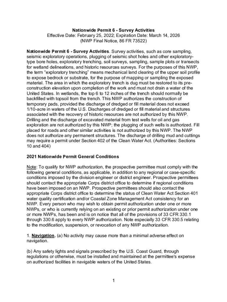 Nationwide Permit 6 Survey Activities Effective Date: February 25, 2022; Expiration Date: March 14, 2026 (NP Final Notice, 86 FR 73522) Nationwide Permit 6 Survey Activities. Survey activities, such