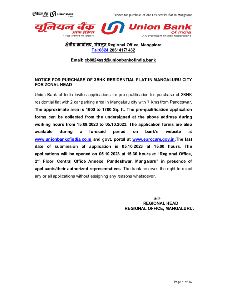 Email: cb8824ssd@unionbankofindia.bankNOTICE FOR PURCHASE OF 3BHK RESIDENTIAL FLAT IN BENGALURU