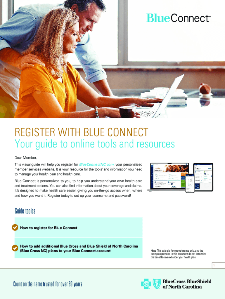 REGISTER WITH BLUE CONNECT Your guide to online tools and resources Dear Member, This visual guide will help you register for BlueConnectNC.com, your personalized member services website. It is your