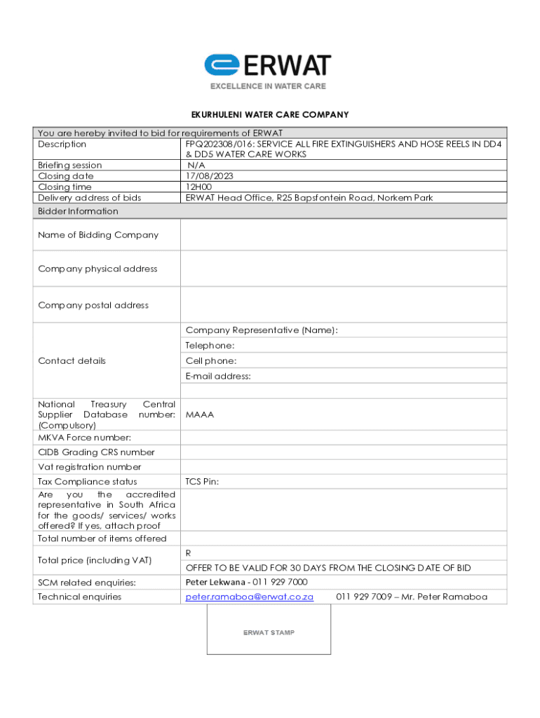 EKURHULENI WATER CARE COMPANY You are hereby invited to bid for requirements of GREAT Description FPQ202308/016: SERVICE ALL FIRE EXTINGUISHERS AND HOSE REELS IN DD4 & DD5 WATER CARE WORKS Briefing