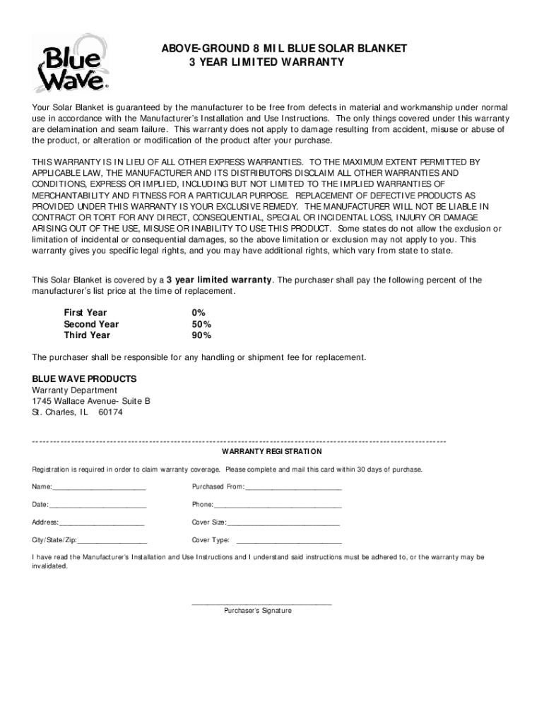 FOREGROUND 8 MIL BLUE SOLAR BLANKET 3 YEAR LIMITED WARRANTYYour Solar Blanket is guaranteed by the manufacturer to be free from defects in material and workmanship under normal use in accordance with