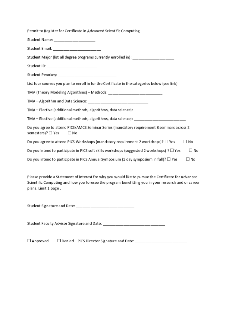 Permit registering for Certificate in Advanced Scientific Computing Student Name: ___ Student Email: ___ Student Major (list all degree programs currently enrolled in): ___ Student ID: ___ Student