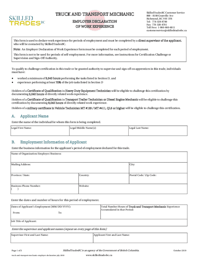 TRUCK AND TRANSPORT MECHANIC EMPLOYER DECLARATION OF WORK EXPERIENCESkilledTradesBC Customer Service 800 8100 Granville Ave Richmond, BC V6Y 3T6 Tel: 7783288700 Fax: 7783288701 Toll Free: 18666606011