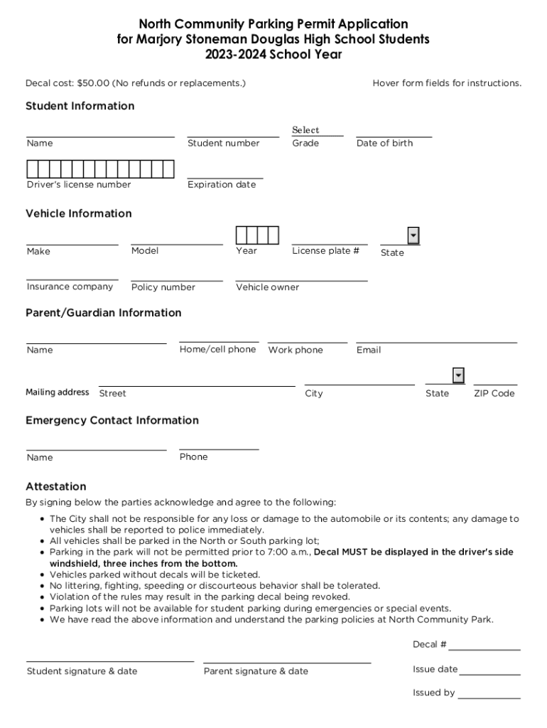 North Community Parking Permit Application for Marjory Stone man Douglas High School Students 20232024 School Year Decal cost: $50.00 (No refunds or replacements.) Hover form fields for instructions.