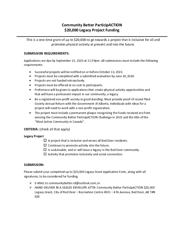 Community Better Participation $20,000 Legacy Project Funding This is a onetime grant of up to $20,000 to go towards a project that is inclusive for all and promotes physical activity at present and