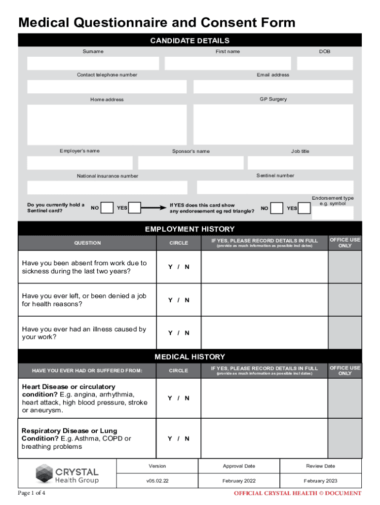 Medical Questionnaire and Consent Form CANDIDATE DETAILS SurnameFirst nameDOBContact telephone numberEmail addressable address GP SurgeryEmployers nameSponsors name Job titleSentinel numberNational