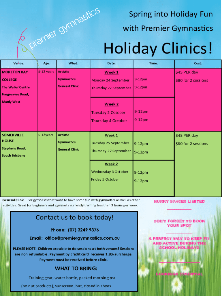 Venue:Age:What:512 yearsMORETON Mandate:ArtisticTime:Week 1Cost:$45 PER dayCOLLEGEGymnasticsMonday 24 September Waller CentreGeneral