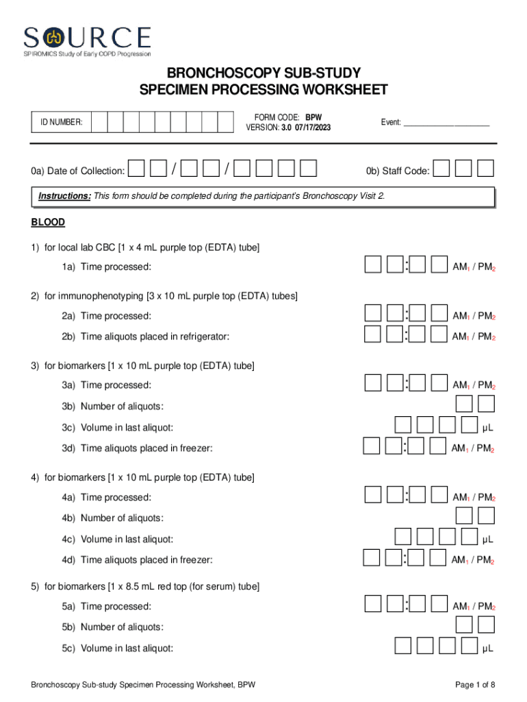 BRONCHOSCOPY SUBSIDY SPECIMEN PROCESSING WORKSHEET FORM CODE: BMW VERSION: 3.0 07/17/2023ID NUMBER:0a) Date of Collection://Event: ___0b) Staff Code:Instructions: This form should be completed during