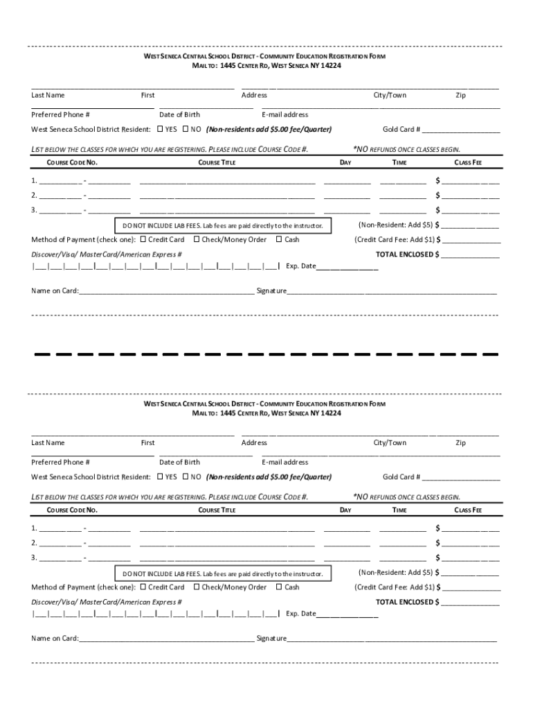 WEST SENECA CENTRAL SCHOOL DISTRICT COMMUNITY EDUCATION REGISTRATION FORM MAIL TO: 1445 CENTER RD, WEST SENECA NY 14224 ___ ___ Last Name First Address City/Town Zip __ ___ ___ Preferred Phone # Date