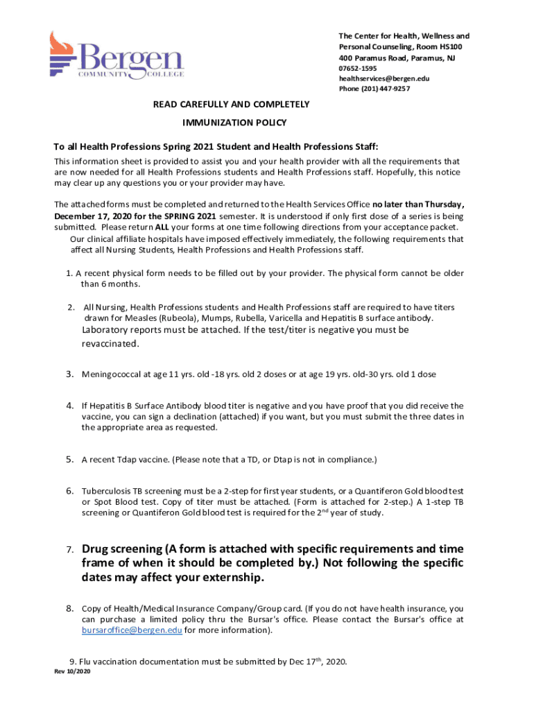 The Center for Health, Wellness and Personal Counseling, Room HS100 400 Para mus Road, Para mus, NJ 076521595 healthservices@bergen.edu Phone (201) 4479257READ CAREFULLY AND COMPLETELY IMMUNIZATION