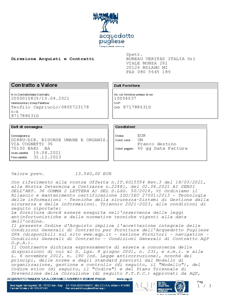 FAX 080 5645 189Direzione Acquit e ContrattiContratto a ValoreDati Fornitore2000016829/19.04.202110004637N.RO Contralto/data Contractors.