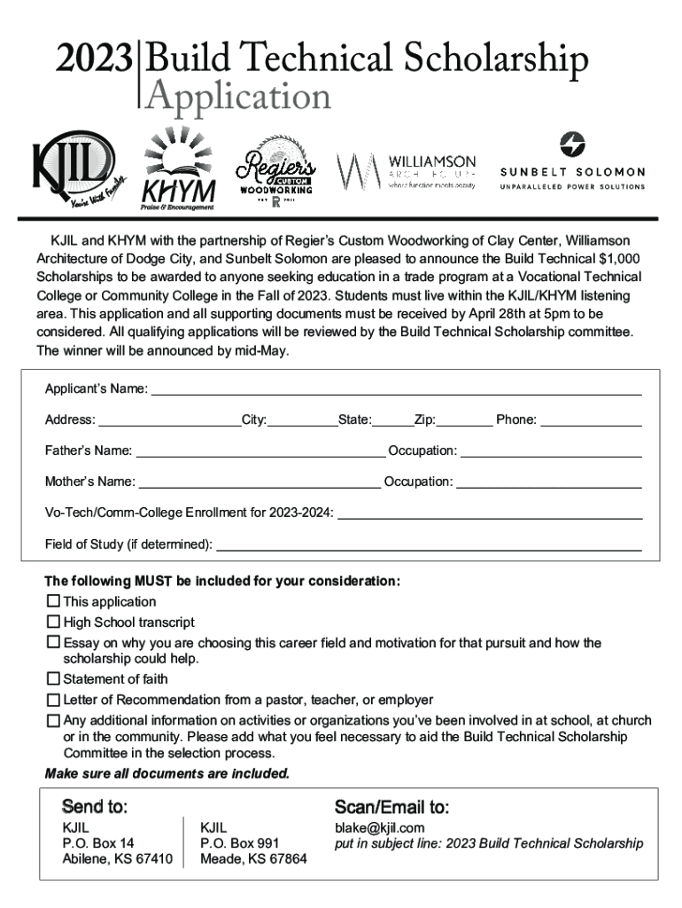 2023 Build Technical Scholarship Application KJ IL and KHM with the partnership of Regains Custom Woodworking of Clay Center, Williamson Architecture of Dodge City, and Sunbelt Solomon are pleased