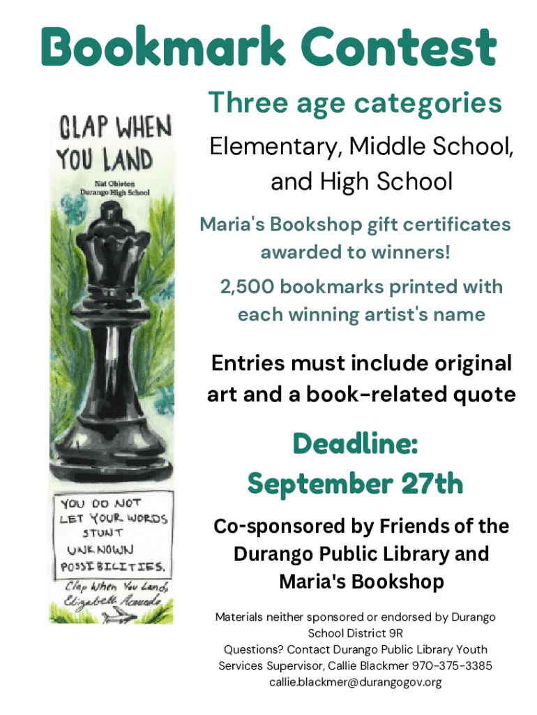 Bookmark Contest Three age categories Elementary, Middle School, and High School Maria\'s Bookshop gift certificates awarded to winners! 2,500 bookmarks printed with each winning artist\'s reentries