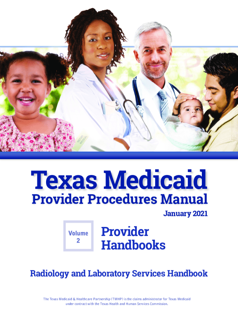 Texas MedicaidProvider Procedures Manual January 2021Provider Handbooks Radiology and Laboratory Services Handbook The Texas Medicaid & Healthcare Partnership (MHP) is the claims' administrator for