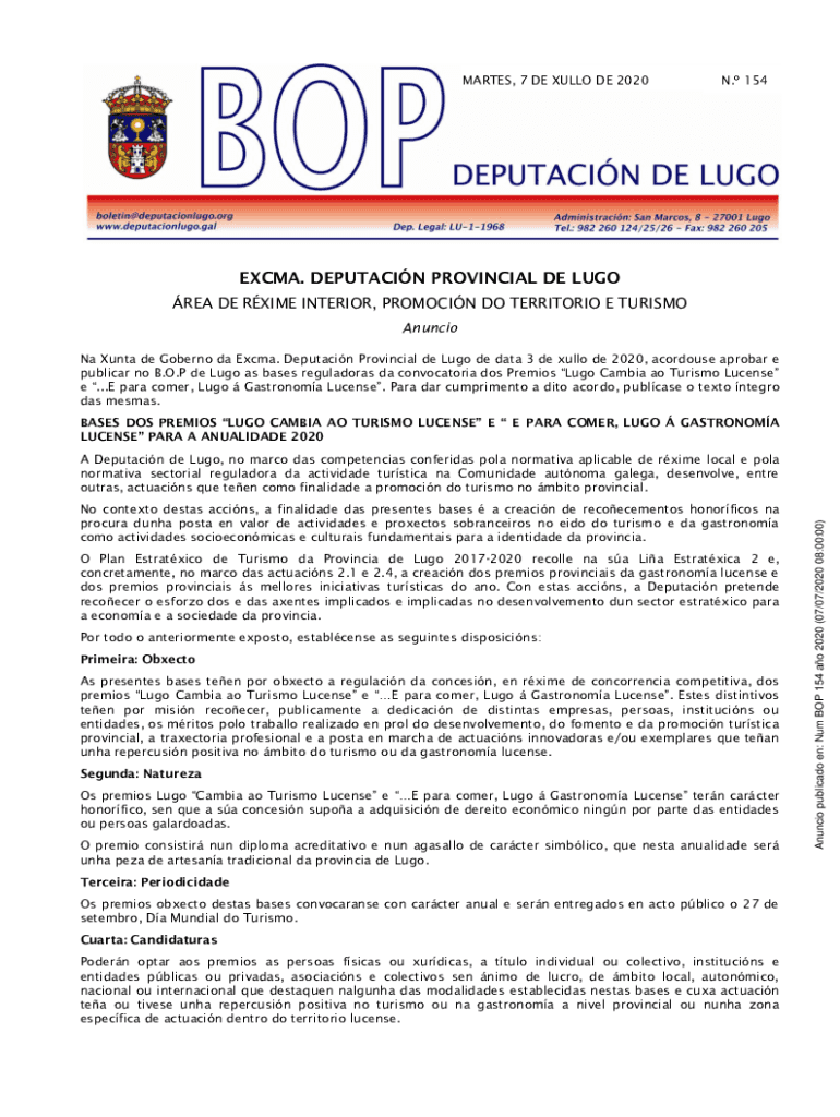 MATES, 7 DE FULL DE 2020 N. 154EXCMA. DEPUTATION PROVINCIAL DE LUGO REA DE RIME INTERIOR, PROMOTION DO TERRITORY E TOURISM Nuncio Na Junta de Goberno the Extra. Deputation Provincial de Lugo de data