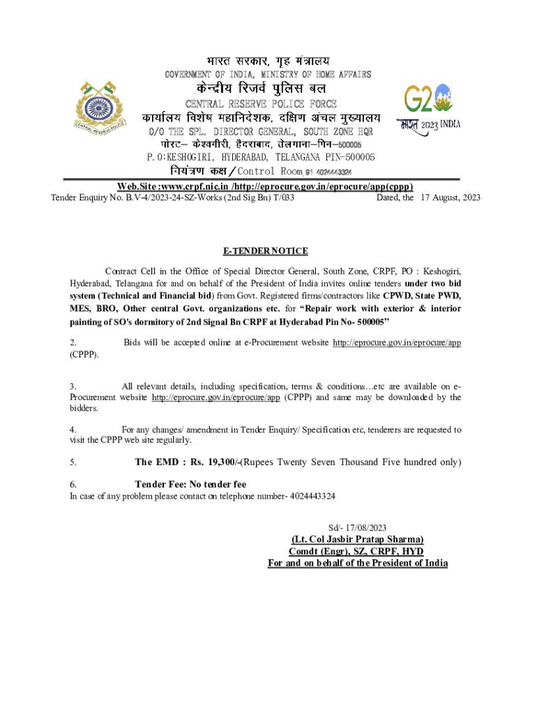 GOVERNMENT OF INDIA, MINISTRY OF HOME AFFAIRSCENTRAL RESERVE POLICE FORCE O/O THE SPL. DIRECTOR GENERAL, SOUTH ZONE HQR500005 P. O:KESHOGIRI, HYDERABAD, TELANGANA PIN PIN500005Control Room +91 4024443324