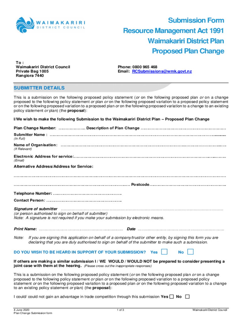 Submission Form Resource Management Act 1991 Waimakariri District Plan Proposed Plan Change To : Waimakariri District Council Private Bag 1005 Angora 7440Phone: 0800 965 468 Email: RCSubmissions@wmk.govt.nzSUBMITTER