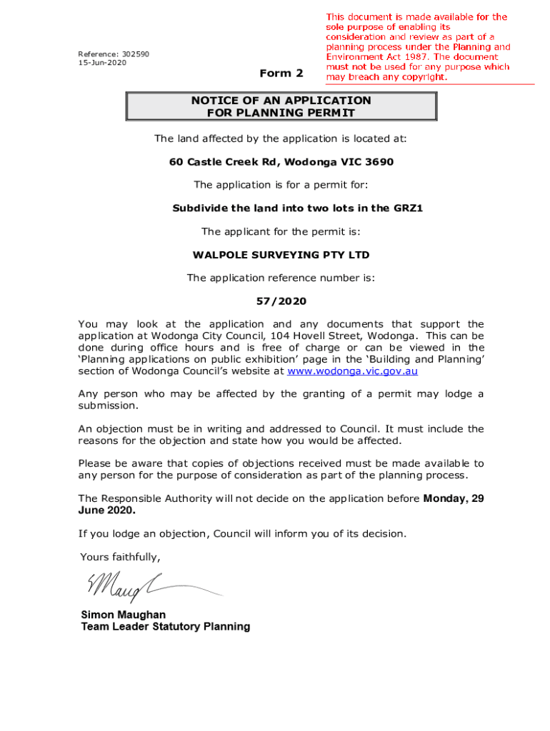 Reference: 302590 15Jun2020Form 2 NOTICE OF AN APPLICATION FOR PLANNING PERMIT The land affected by the application is located at: 60 Castle Creek Rd, Wodonga VIC 3690 The application is for a permit