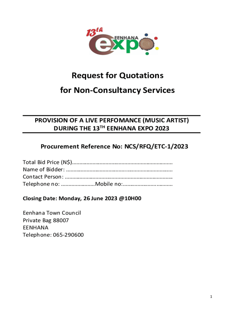 Request for Quotations for Consultancy ServicesPROVISION OF A LIVE PERFORMANCE (MUSIC ARTIST) DURING THE 13TH ELEPHANT EXPO 2023 Procurement Reference No: NCS/RFQ/ETC1/2023 Total Bid Price (NO)...