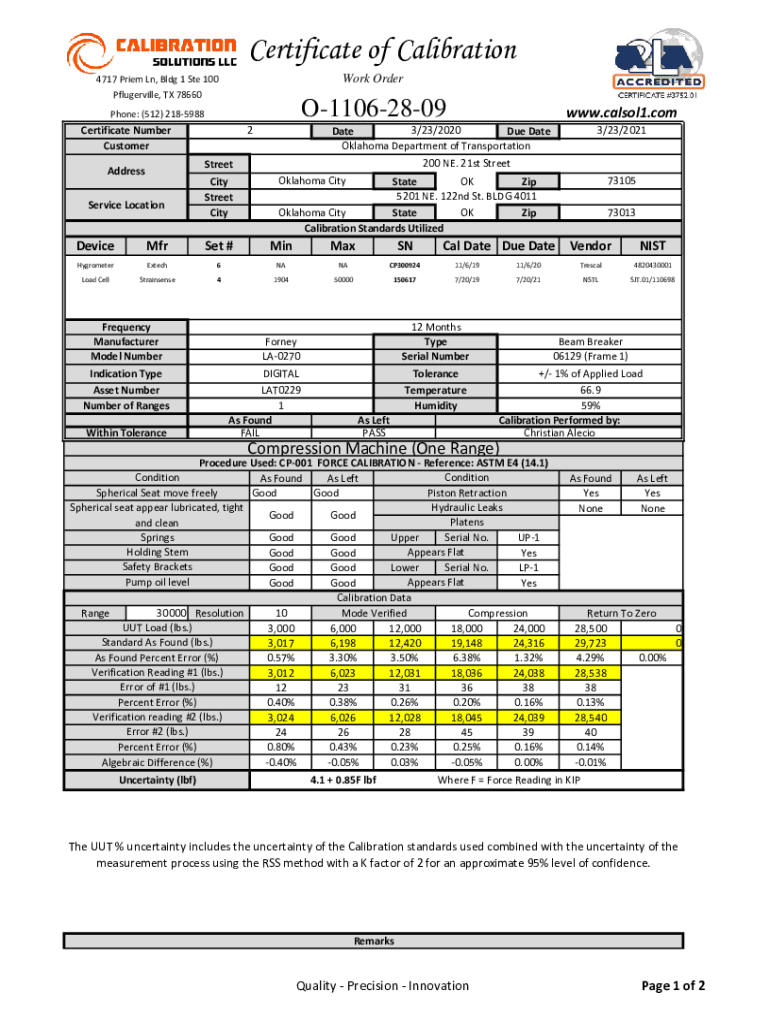 Certificate of Calibration 4717 Prime Ln, Bldg 1 Ste 100Work OrderPflugerville, TX 78660O11062809Phone: (512) 2185988Certificate Number Customer Address Service Location2 Street City Street Citywww.calsol1.com3/23/2020