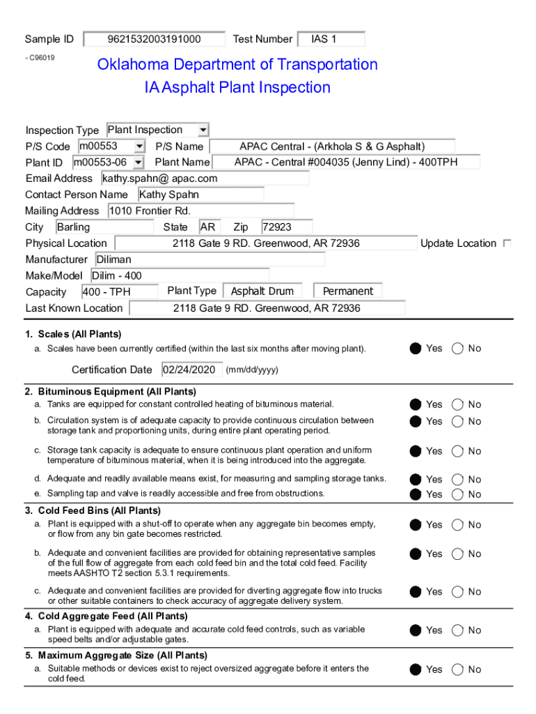 Sample ID C960199621532003191000Test Number IAS 1Oklahoma Department of Transportation IA Asphalt Plant InspectionInspection Type Plant Inspection P/S Code m00553 P/S Name Plant ID m0055306 Email