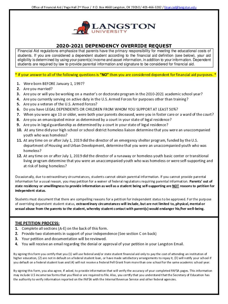 Office of Financial Aid / Page Hall 2nd Floor / P.O. Box #668 Langston, OK 73050 / 4054663282 / financial@langston.edu20202021 DEPENDENCY OVERRIDE REQUEST Financial Aid regulations emphasize that