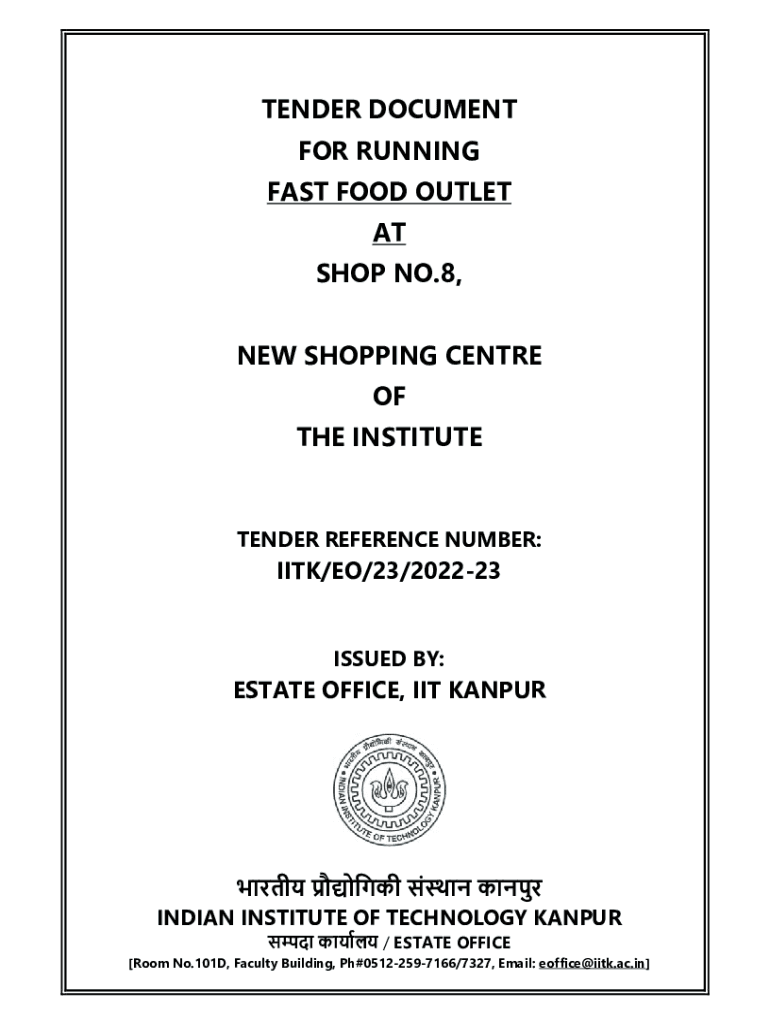 TENDER DOCUMENT FOR RUNNING FAST FOOD OUTLET AT SHOP NO.8, NEW SHOPPING Center OF THE INSTITUTETENDER REFERENCE NUMBER:IIT/EO/23/202223 ISSUED BY:ESTATE OFFICE, IIT KANPUR INDIAN INSTITUTE OF TECHNOLOGY