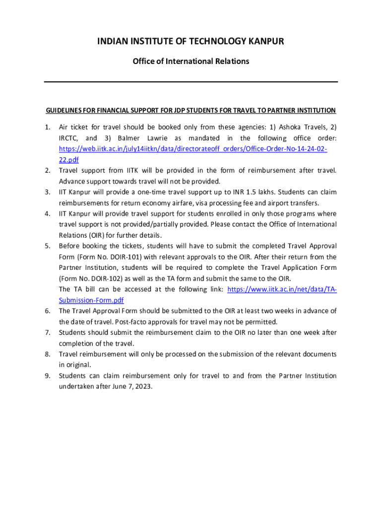 INDIAN INSTITUTE OF TECHNOLOGY KANPUR Office of International RelationsGUIDELINES FOR FINANCIAL SUPPORT FOR GDP STUDENTS FOR TRAVEL TO PARTNER INSTITUTION1.2. 3. 4.5.6. 7. 8. 9. Air ticket for travel