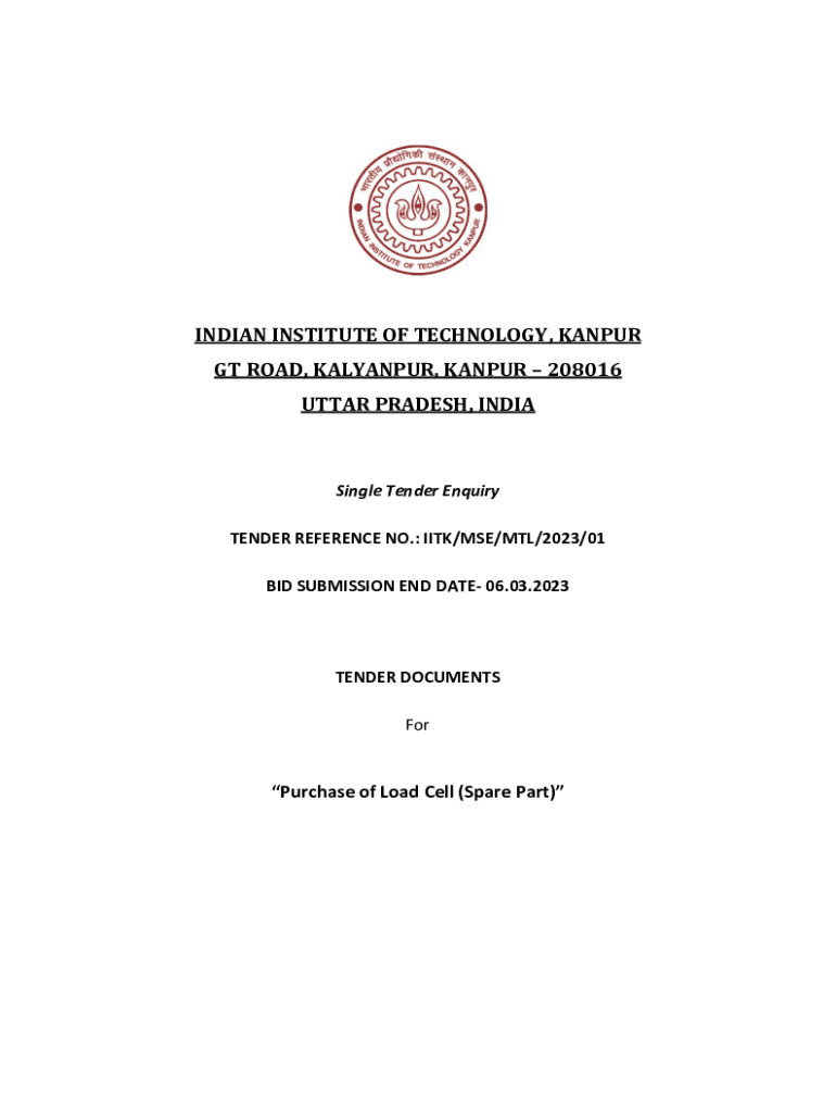 INDIAN INSTITUTE OF TECHNOLOGY, KANPUR GT ROAD, KANPUR, KANPUR 208016 UTTAR PRADESH, INDIASingle Tender Inquiry TENDER REFERENCE NO.: IIT/MSE/MTL/2023/01 BID SUBMISSION END DATE 06.03.2023TENDER DOCUMENTS