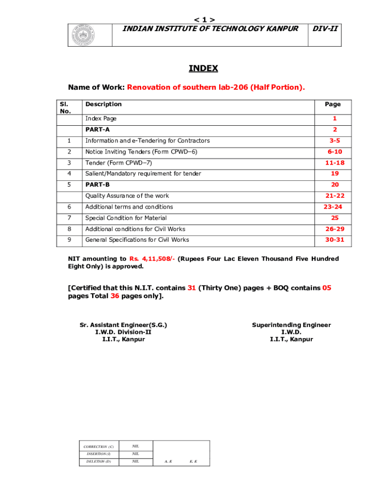 1INDIAN INSTITUTE OF TECHNOLOGY KANPURDIVIIINDEX Name of Work: Renovation of southern lab206 (Half Portion). SL. No. DescriptionPageIndex Page1PARTA21Information and tendering for Contractors352Notice